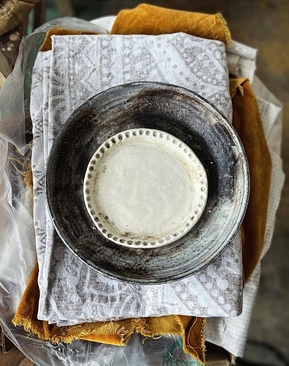 Plates are difficult to potter. Each piece need a special handling and the production takes more time than normal. I had to find out that plates needs the slowness and a high diligence. Over the years many pieces were broken before or after firing. I’m still learning from my faults and collect valuable experiences.
